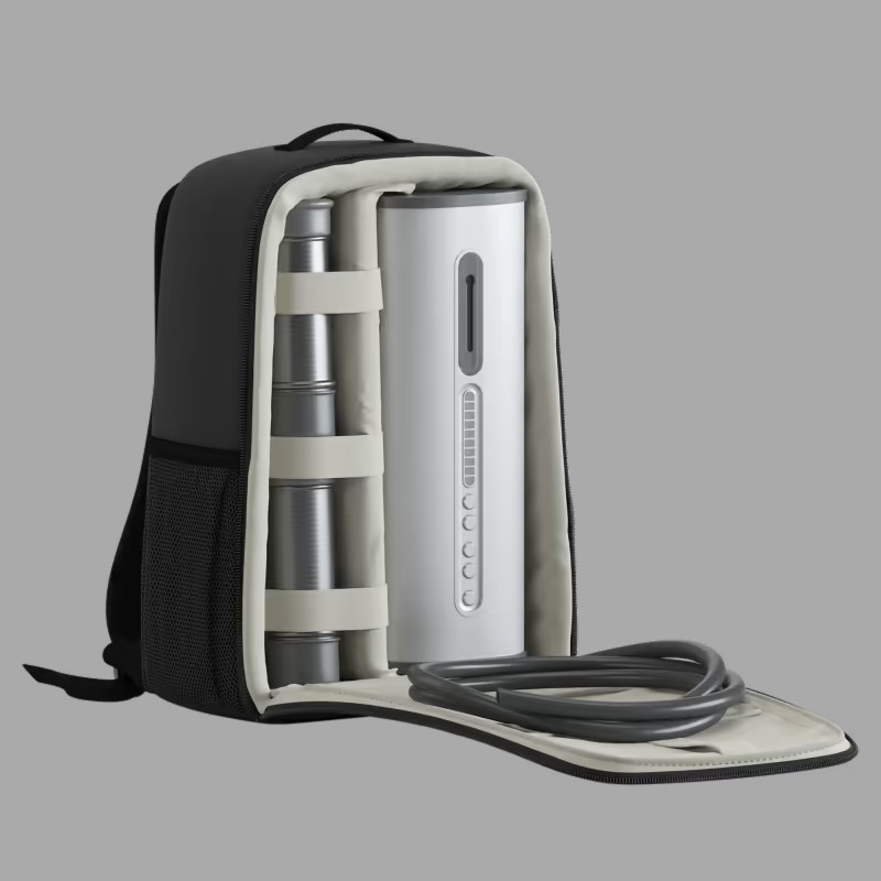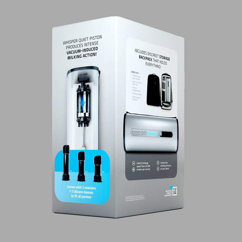 Die ca. 6 kg schwere Masturbationsmaschine besteht aus einem robusten Gehäuse aus extrudiertem Aluminium mit einer Wandstärke von ca. 3,2 mm. Für ihre Größe arbeitet die Melkmaschine erstaunlich leise und erzeugt vor allem ein dezentes Summen von Kolben und Motor. Für Ordnung und Diskretion liegt eine hochwertige Aufbewahrungstasche bei.