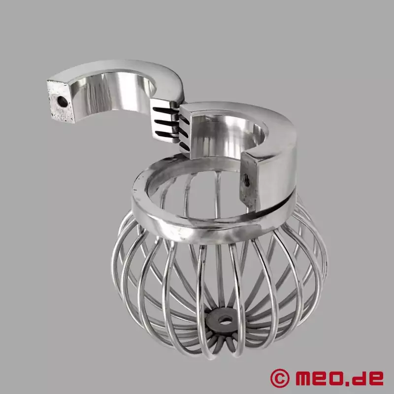 An extraordinary piece of BDSM jewellery, a fantastic ballstretcher, and at the same time an adjustable cage for the family jewels - his balls. Effective and visually appealing, the testicles are locked behind bars and exposed to the irresistible force of gravity... with almost half a kilo in weight.