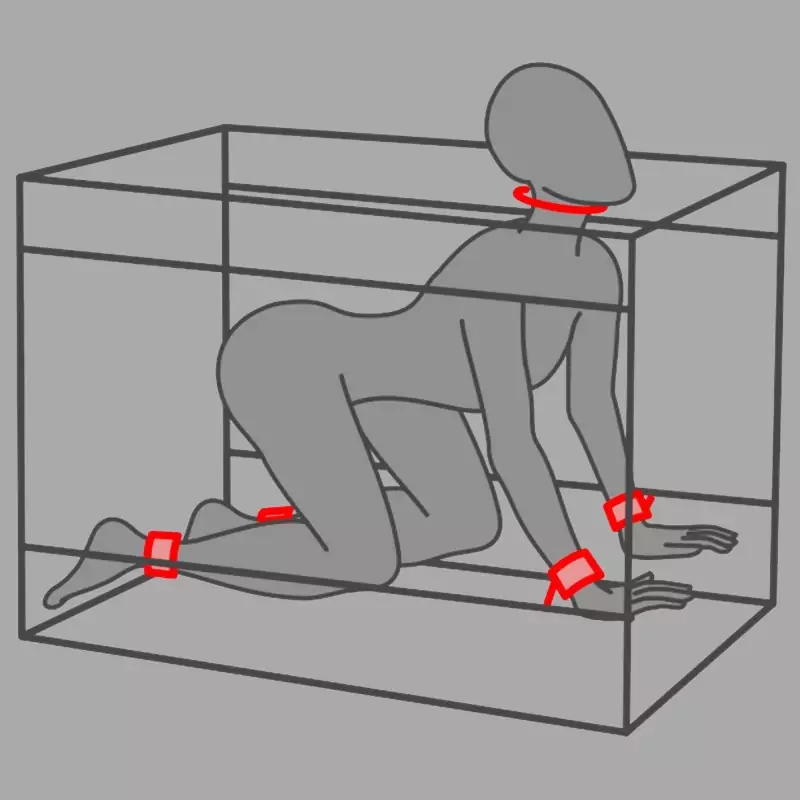 A soft floor mat and LED lighting add comfort, while the included wrist and ankle restraints (one pair each) with soft padding and buckle closures ensure secure fixation. The restraints can be placed anywhere inside, allowing you to decide exactly how your sub is presented.