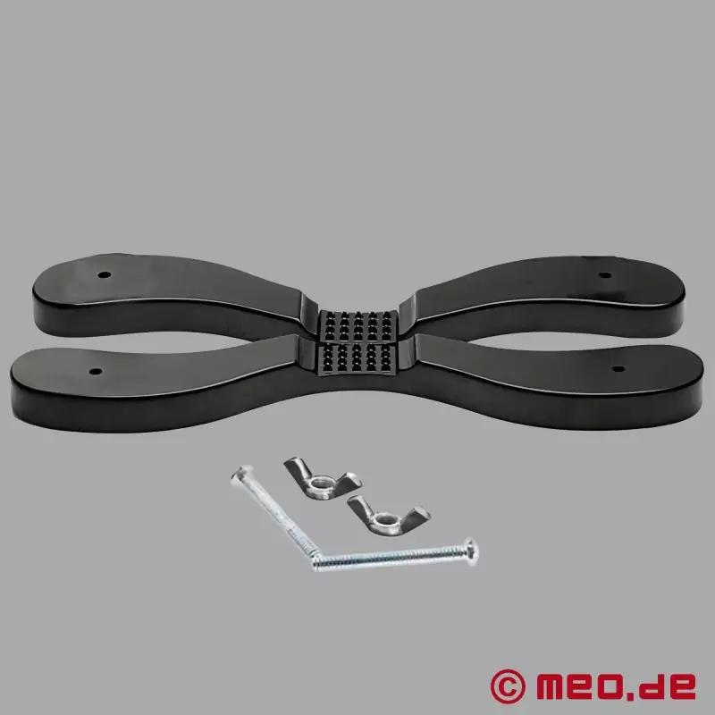 The submissive man kneels down on the floor. Before the Humbler™ is applied, the scrotum is pulled backwards between the slightly parted thighs and carefully guided into the oval opening. The two halves of the Humbler™ are then joined and secured with screws, firmly clamping the scrotum and ensuring the testicles protrude correctly.
