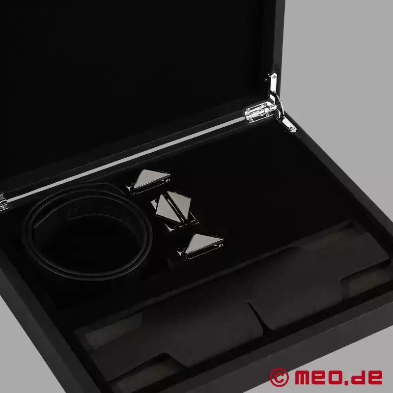 The Lockink™ x MEO® blindfold is visually striking and functionally well designed. The set includes a long leather strap, adjustable fasteners, a leather eye cover, and matching metal components. The result is a modular system that can be used securely, comfortably, and flexibly. The adjustable strap ensures a comfortable fit and allows precise adjustment to the head.