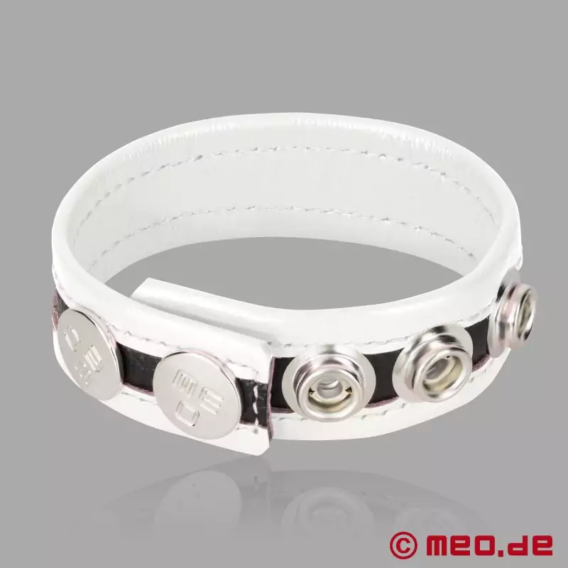 Comfortably adjustable with a classic design and easy handling. Thanks to the snap-button closure, this black and white leather cock ring can be adjusted to the perfect fit. The white variant is traditionally associated with the desire for mutual masturbation.