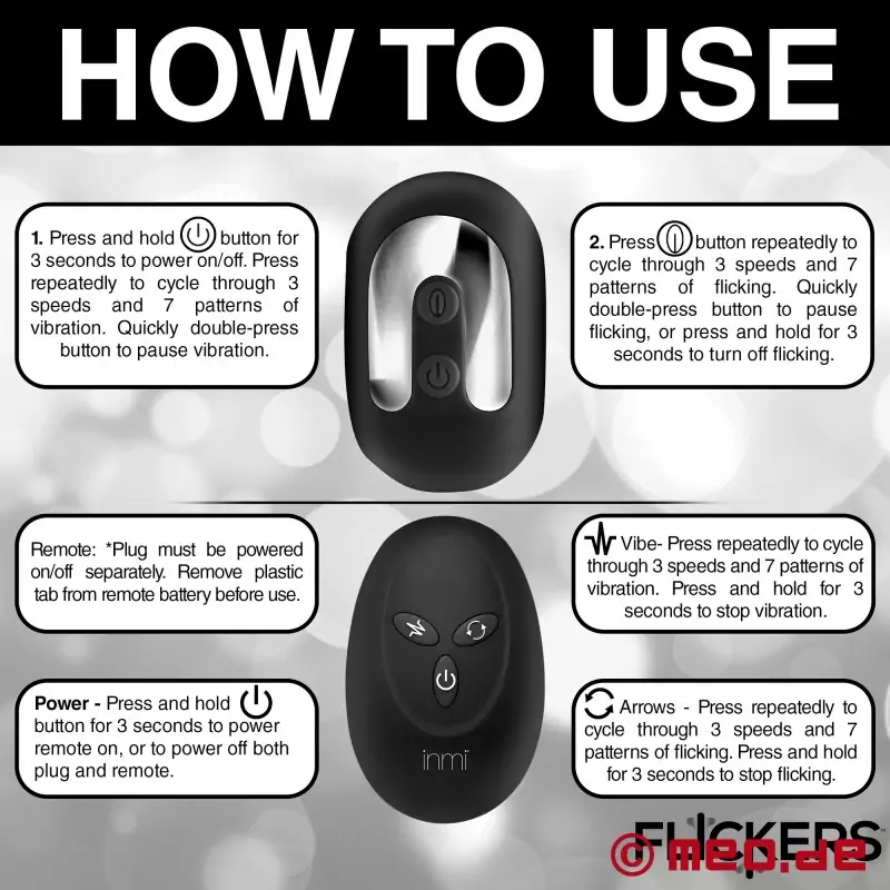 Turn on the sex toy, connect it to the remote control and apply your favorite lubricant to the butt plug and anus. Insert the butt plug slowly, taking your time and enjoying every inch. Once the butt plug is fully inserted, adjust the position and then turn on the vibration and flicking functions. The intensity is immediately noticeable and stimulates the prostate (for men) or the A-spot (for women)! The sensations will flow through your entire body, combining the feeling of fullness with incredible stimulation. Use the butt plug alone, invite a partner or enjoy it while watching your favorite porn.