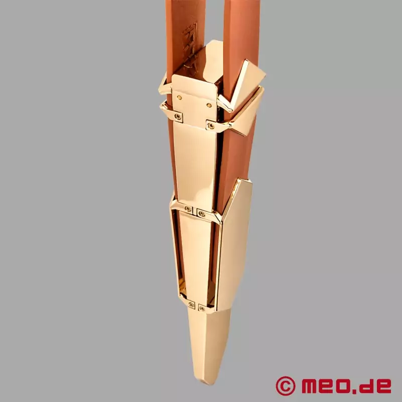 The Lockink™ x MEO® slapper combines a luxurious look, premium materials, and thoughtful technical design to create an especially effective impact play accessory. Genuine cowhide and gold-tone metal accents come together with an adjustable strap length to create an option that feels both elegant and intense for spanking sessions, roleplay, and controlled dominant BDSM dynamics.