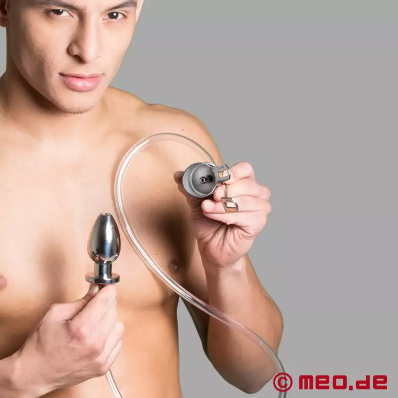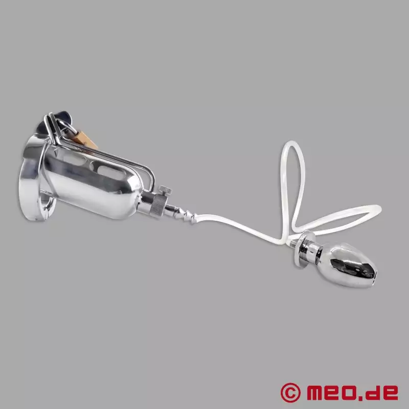 This SM toy is the perfect accessory for connoisseurs and lovers of urethral and anal pleasures! The hollow dilator or penis plug is inserted into the penis and generates particularly intense stimulation, while the genitals are fully enclosed by the chastity belt. The penis plug is connected to the hollow anal plug via a hose, which can be inserted into the anus. This way, the pee can be fed directly from the penis into the anus, almost like an enema, without wasting a valuable drop. Our VERYDEEP lubricating gel should be used to insert the penis plug and our MANCUNT hybrid lube should be used for the butt plug. The penis plug is gently inserted into the urethra, the hose is run between the legs and the anal plug is then sunk into the user’s own anus. The anal plug can of course also be inserted into the partner's anus, in order to give him a nice enema experience.