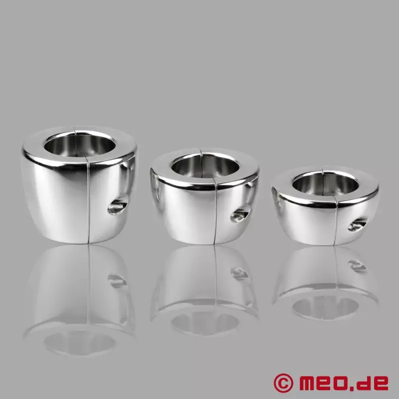 Massif, lourd et conçu pour une dilatation du scrotum nettement perceptible, BellLock™ de MEO® est un ballstretcher en acier inoxydable à forme de cloche. Grâce à son poids élevé, à sa forme ergonomique et à sa fabrication soignée en deux parties, il procure une traction intense et directe ainsi qu’une sensation de port particulièrement présente.