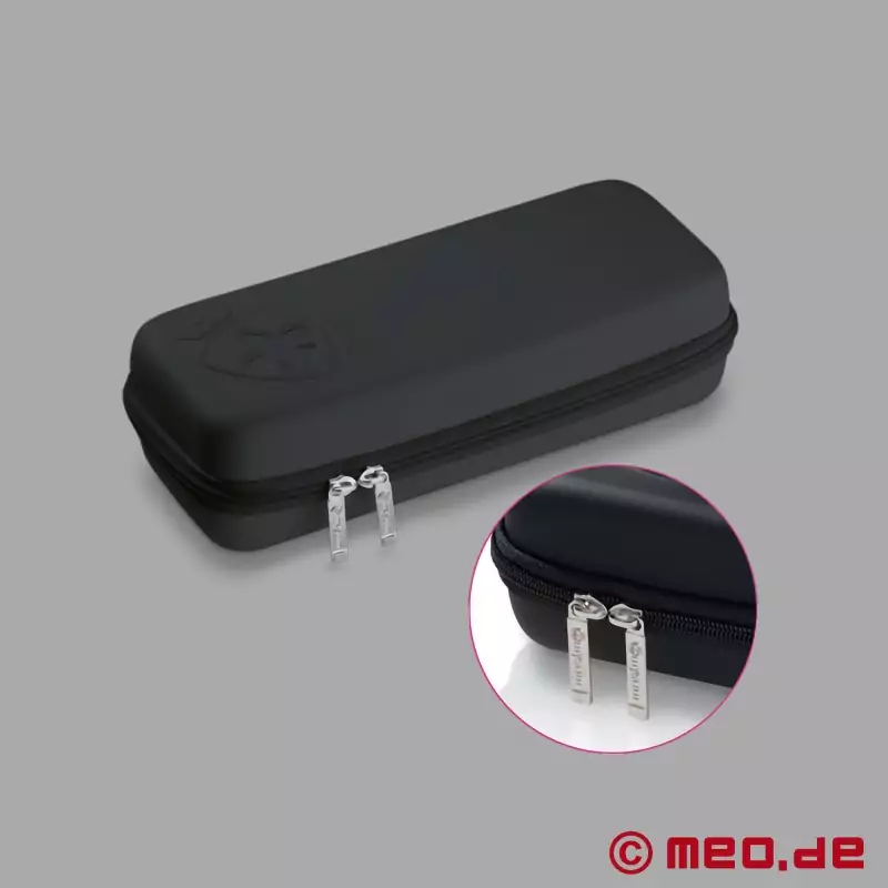 Der Mystim-Vibrator kommt in einer edlen, großzügigen Hardcase-Verpackung mit Reißverschluss, hier ist sogar noch reichlich Platz für weitere E-Stim Accessoires.