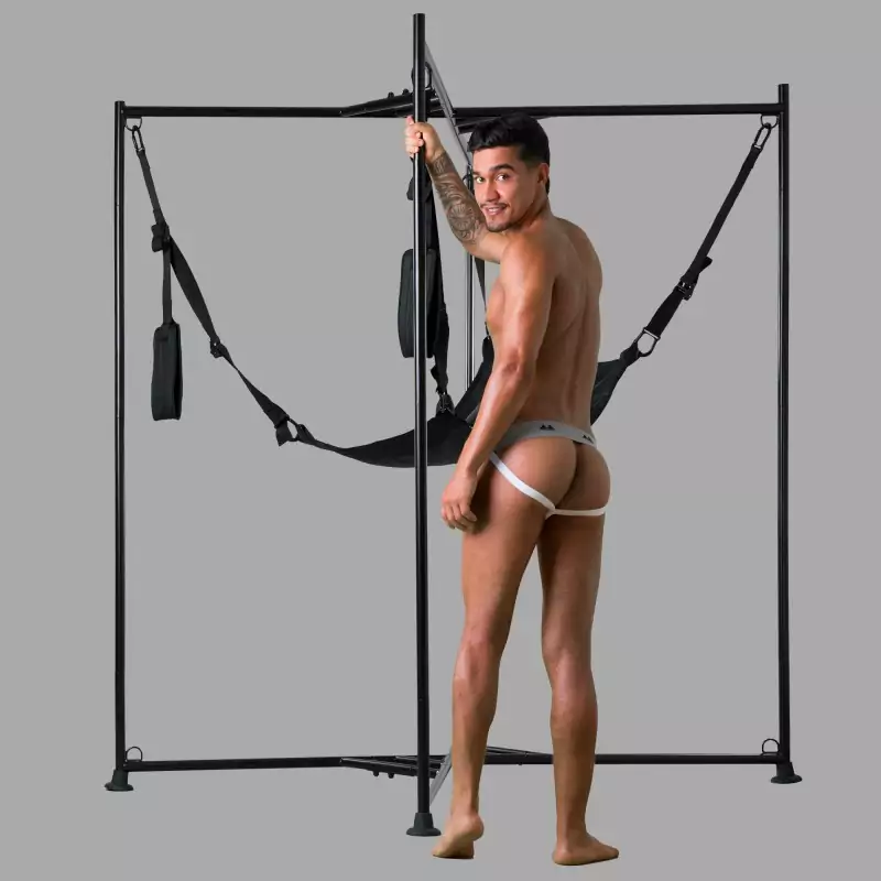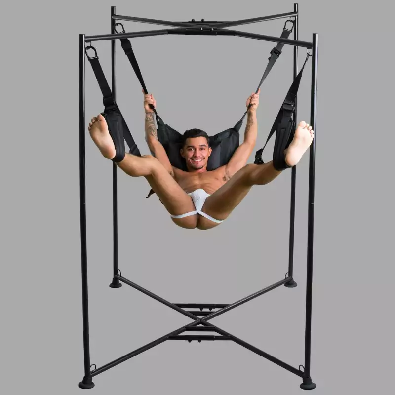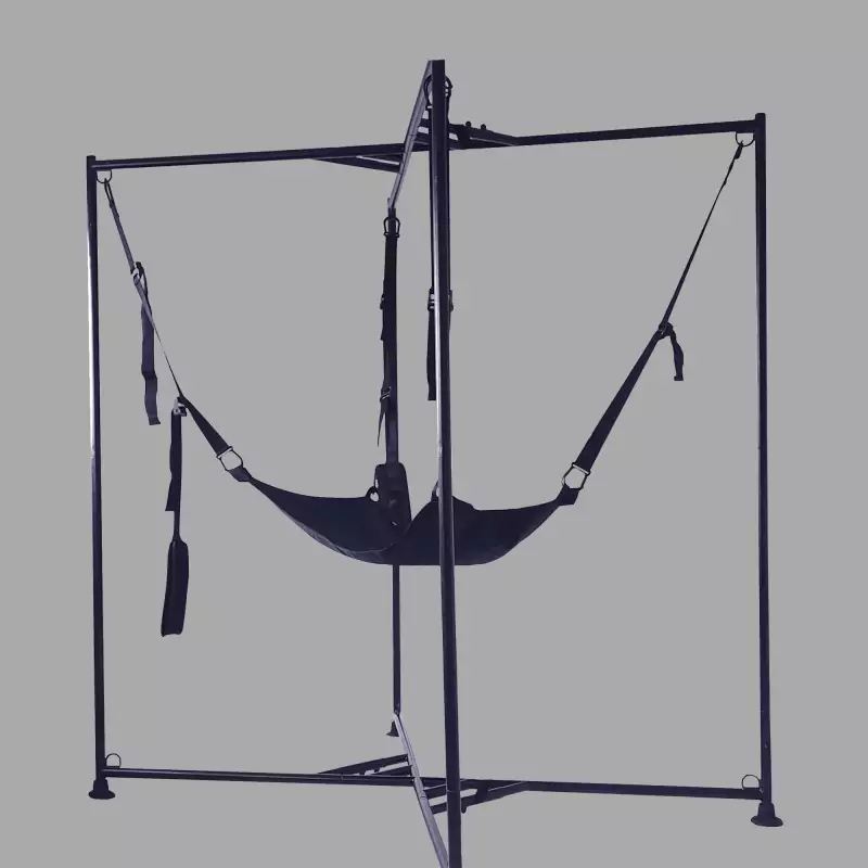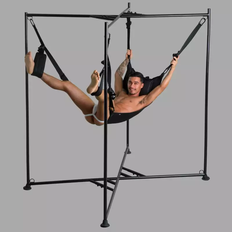 Le cadre robuste est maintenu en place par des pieds en caoutchouc antidérapants. Aucun crochet n'est nécessaire au plafond ni au mur. Toutes les sangles se règlent sans quitter le sling. Des œillets supplémentaires à la base du cadre permettent de pratiquer le bondage.