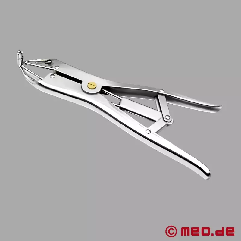 La pince d’élastration s’utilise pour accrocher nos anneaux d’élastration en latex. Enfile un anneau autour des quatre pointes, resserre le manche pour que les pointes se libèrent et étirent l’anneau. Place l’anneau écarté sur un téton et desserre lentement ta préhension.