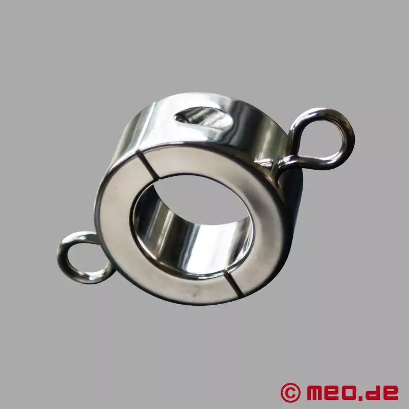 Unterschätzt mir nicht diese schlicht aussehenden Ballstretcher, gerade in den größeren Optionen hat er echt ordentlich Gewicht. An die Schlaufen könnt ihr wie im Bild abgebildet einfach Manschetten verbinden oder mit einer eigenen Fesselung kreativ werde. Ein Traum!