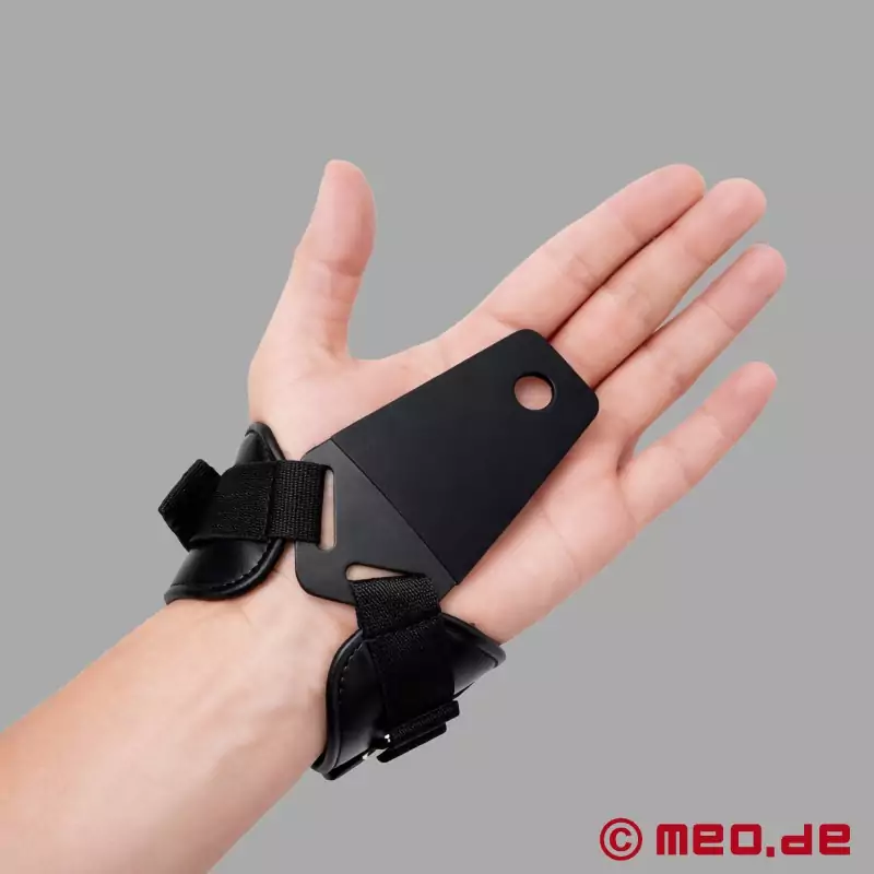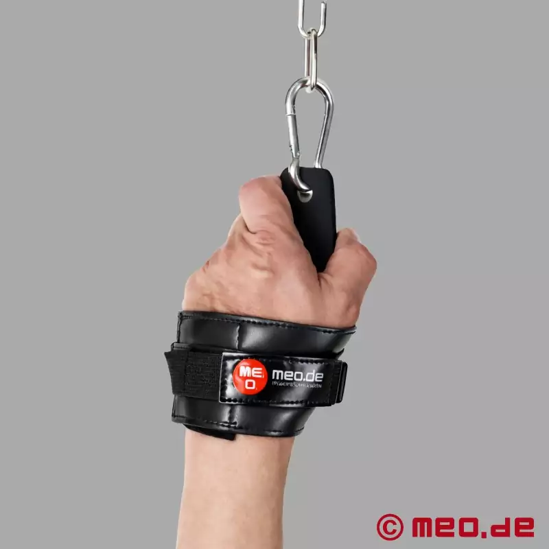Tökéletesen alkalmazkodik az anatómiához, a tenyér területén beépített lemez biztosítja az optimális teherelosztást. A nagyszerű anyag könnyű párnázással biztosítja a tökéletes illeszkedést, míg a dupla erősségű tépőzár gyors rögzítést tesz lehetővé és garantálja a megfelelő illeszkedést. A bilincsek láncokhoz vagy kötelekhez (felfüggesztés, hog tie bondage stb.) csatlakoztathatók a tartozékban található karabinerek segítségével.