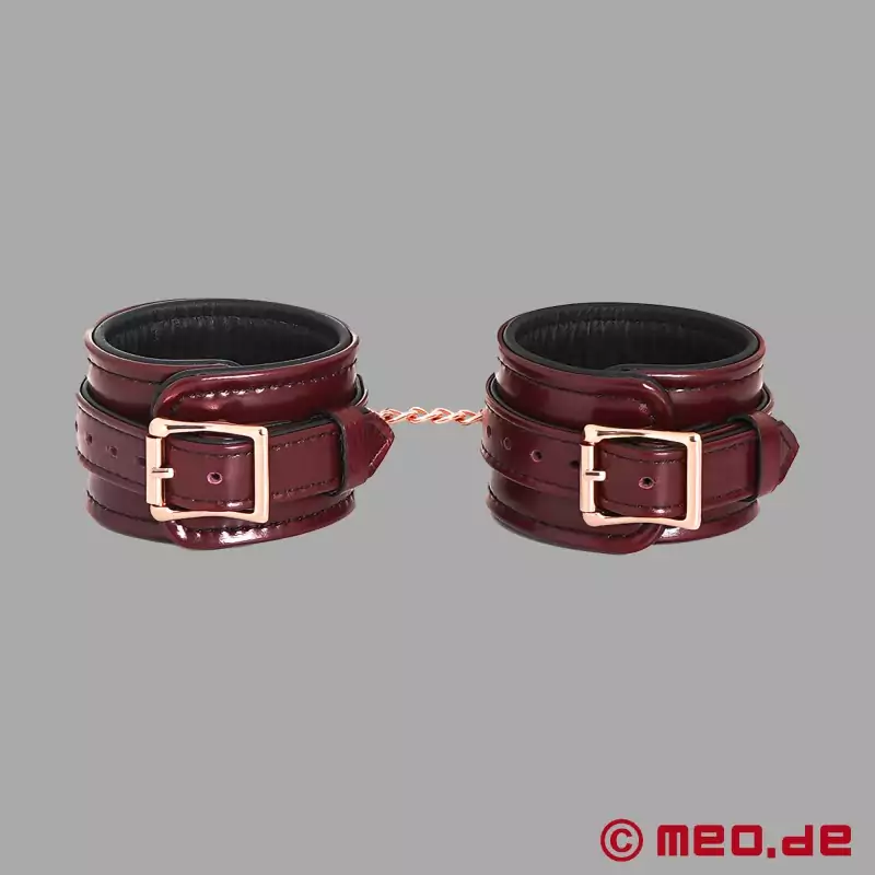 Kompromisszummentes elegancia, maximális kényelem és magas funkcionalitás jellemzi ezeknek a bordó, japán marhabőrből készült, báránynappa bőrrel bélelt boka bilincseknek a kialakítását. A MEO®, az egyik legtapasztaltabb németországi BDSM-termékgyártó a Noblesse kollekcióhoz olyan boka bilincseket készít, amelyek formájukban és színükben egyediek, és a legapróbb részletekig tökéletesen átgondoltak.