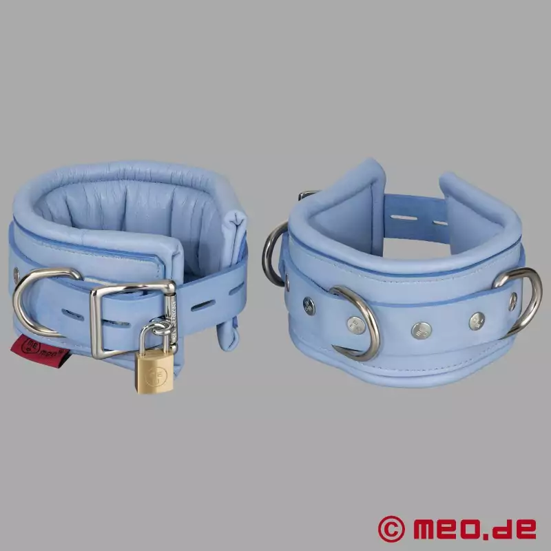 Az azúrkék boka bilincseken kívül a Malibu kollekcióhoz tartozó bilincsek és egy elegáns bondage nyakörv is tartozik - mindegyik zárható és készletben vagy külön-külön is kapható. Minden terméket lakattal, kulccsal és részletes ápolási útmutatóval szállítunk. Az ambiciózus önmegkötözéshez a boka bilincsek opcionálisan kompatibilisek a digitális MEOBOND™ időzárral.
