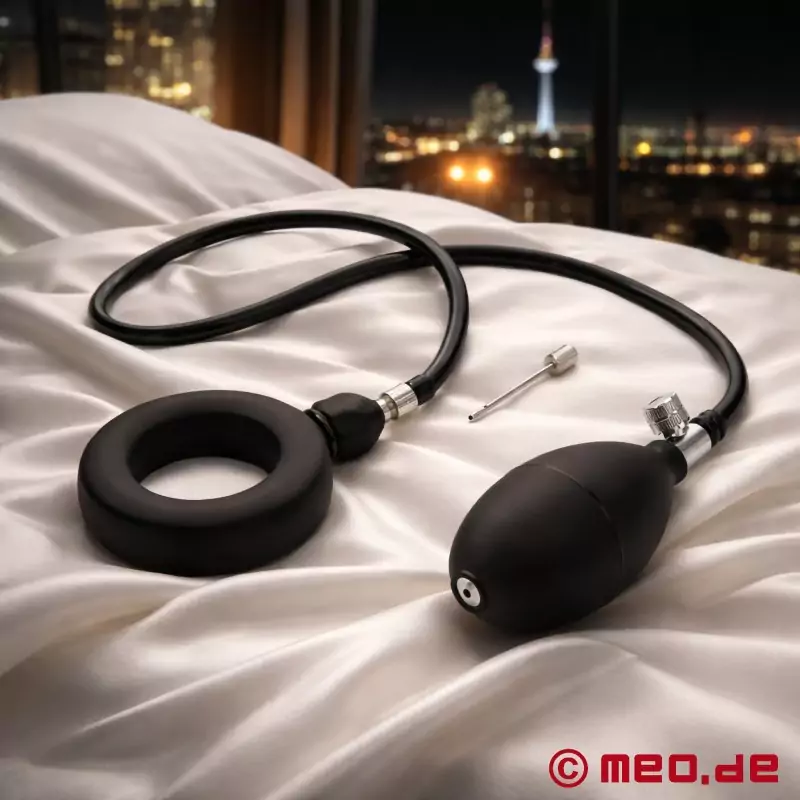 Helyezze fel a szilikongyűrűt, amikor nincs erekciója, a pénisz töve köré, a herezacskó köré vagy mindkettő köré, attól függően, hogy Ön mit szeretne. Lassan pumpáljon, amíg el nem éri a kívánt feszességet. A gyűrű befelé domborodik és nagyon erősen nyom. Eleinte az erekció fokozódik, majd lassan kényelmetlenebbé válik. A levegő finom adagokban engedhető ki a fémszelepen keresztül - a maximális élvezetet nyújtó, ellenőrzött CBT ülésekhez.