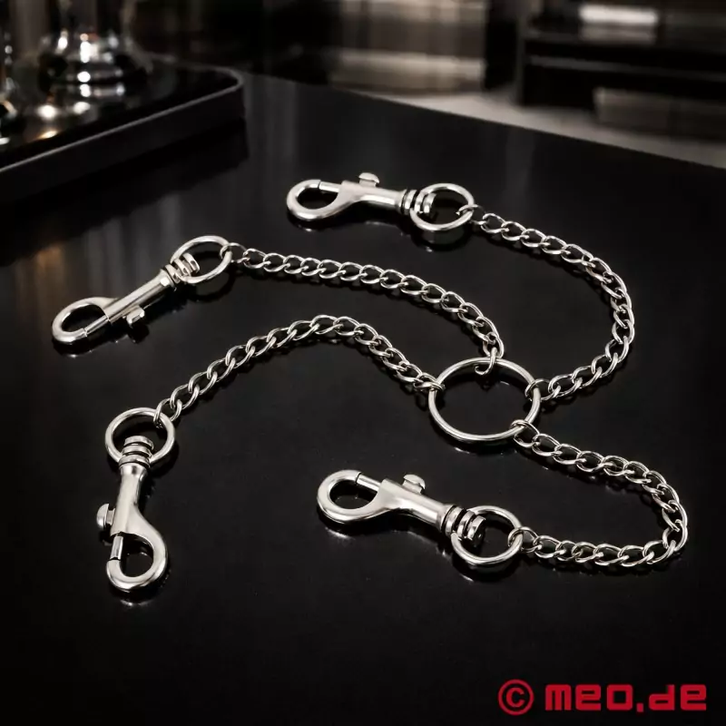 Ez a rozsdamentes acélból készült csatlakozó gyorsan és egyszerűen teszi lehetővé a kifinomult Hogtie-kötések létrehozását a kötés során. Ennek a csatlakozónak a robusztus láncai olyan erősek, hogy könnyedén ellenállnak az erőteljes rabszolgák erősebb húzásainak is. A 4 karabinerhorog bilincsekhez és boka bilincshez rögzíthető, és jelentősen korlátozza a partner mozgásszabadságát, így teljesen ki van szolgáltatva.