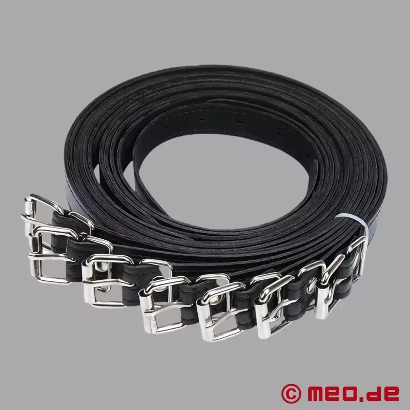 A vegán bőrből készült bondage szíjjal gyors, egyszerű és biztonságos bondage lehetséges, pillanatok alatt. A választott bondage heveder hosszától függően a végtagok, például a csuklók és a bokák összeköthetők, vagy a Sub egy oszlophoz, egy Szent András-kereszthez vagy az ágyhoz köthető. A rabságpánt folyamatos perforációja lehetővé teszi a rugalmas beállítást, így a rabsági ülés során változtatható, és a rabságpánt szükség esetén bármikor szorosabbra húzható.