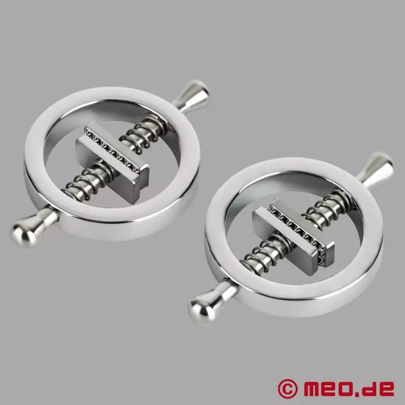 A mellbimbó karikáink két csavarral vannak ellátva, amelyek egyenletesen osztják el a nyomást az egész mellbimbón. Minél jobban elforgatja az állítócsavarokat, annál intenzívebbé válik az ingerlés, így az enyhe, stimuláló nyomástól a fájdalmas hatásig variálhat. Mivel a mellbimbócsipesz nagyon szoros és nem csúszik le, ezek a rosszfiúk tökéletesek a pajkos játékokhoz útközben vagy a klubban is. Az Iron Maiden mellbimbócsipesz lehűthető (hűtőszekrényben) vagy felmelegíthető (vízfürdőben) a kifinomult hőmérsékletű játékhoz. Próbálja ki!