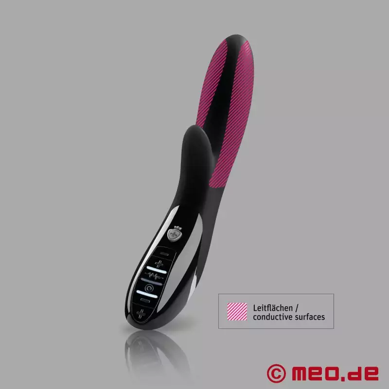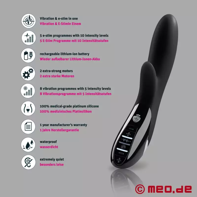 Az alapos tisztításhoz és ahhoz, hogy az elektrosztimulációs dildó mindig használatra kész maradjon, ajánljuk a VeryClean™ spray-t, amelyet kifejezetten a szexuális játékok higiénikus ápolására fejlesztettünk ki. A maximális elektromos vezetőképesség és a különösen csúszós élmény érdekében ajánljuk a MEO® vezető ESHOCK™ gélünket, amely ideális a Vibration! és az elektrostimuláció kombinálásához.
