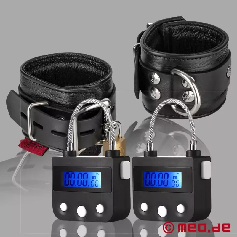 A készlet a következőkből áll: Két MEBOND Bondage időzár és egy pár zárható bőr boka bilincs.