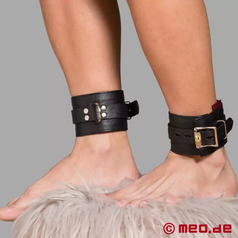 Megmunkálásunk meleg felületet és kellemes tapintást kölcsönöz a bőrnek. A bőr különösen finom szemcsézetű és rugalmas. A durva bőr jellege megmarad bokabilincsünkben, a természetes egyenetlenségeket és hegeket nem takarjuk el mesterségesen. Boka bilincsünk erős szegecselt pántok rögzítik biztonságosan. Egy masszív, speciális fémcsat, valamint a hozzáillő biztonsági zárjaink további zárási lehetőséget biztosítanak.