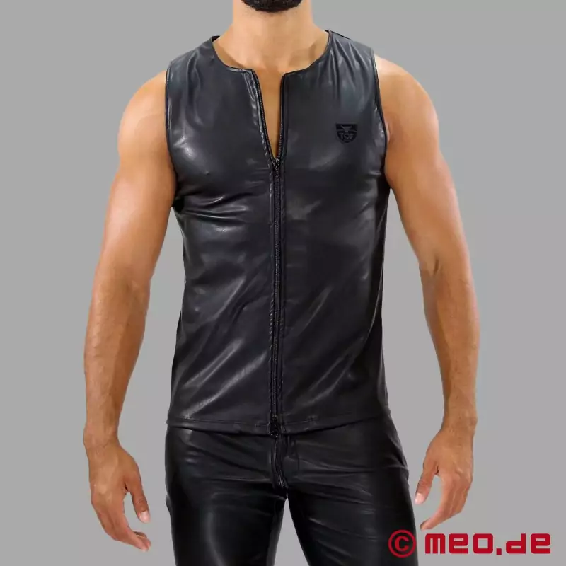 Top formában! A TOF Paris tank top a lehető legjobban kiemeli az izmaidat. A puha minőség lenyűgöző és maximális kényelmet biztosít. Ez az elegáns, fétis stílusú, cipzárral ellátott tank top ultra szexi. Hihetetlenül élethű bőrutánzatból készült. A felhasznált anyag kiváló minősége miatt a különbség első pillantásra szinte felismerhetetlen