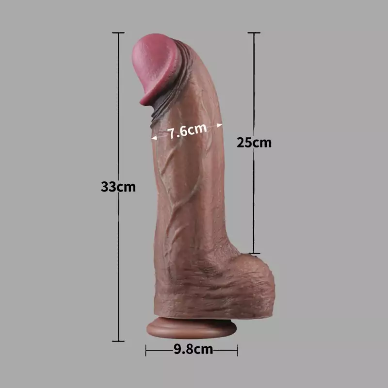 Sötét bőrével, dudorodó ereivel és hatalmas körfogatával úgy néz ki, mint egy igazi "Big Black Cock". A végső érzést keresed szóló szex közben egy nagy dildóval? Ez a kiváló minőségű "kétrétegű szilikonból" készült nagy, valósághű XXL dildó teljesíti a legtitkosabb BBC fantáziádat. A figyelemre méltó 33 cm-es teljes hosszával és 7 cm-es átmérőjével ez a sötét bőrű dildó különösen intenzív és valósághű behatolást biztosít, akár análisan, akár vaginálisan.