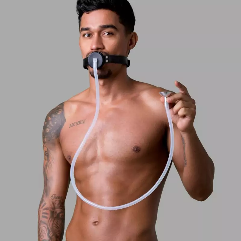 This isn't just a regular gag. It's got a hose and an attached penis sleeve (kind of like a really hard condom for your junk), which has totally amped up my BDSM play. This gag is super popular in MEO's shop and once you've tried it, you'll know why.