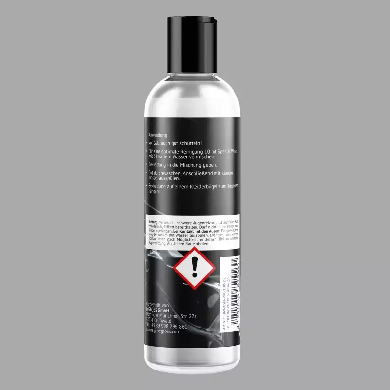 beGLOSS® Special Wash™ è un detergente vegano per capi sexy, lingerie e intimo in vinile, PVC e con effetto vernice. Rimuove sporco e cattivi odori in modo delicato, rapido ed efficace e supporta la cura di capi erotici, lingerie, intimo e accessori. Aiuta a mantenere la flessibilità del materiale e può contribuire a proteggerlo dalla formazione di crepe. Made in Germany.