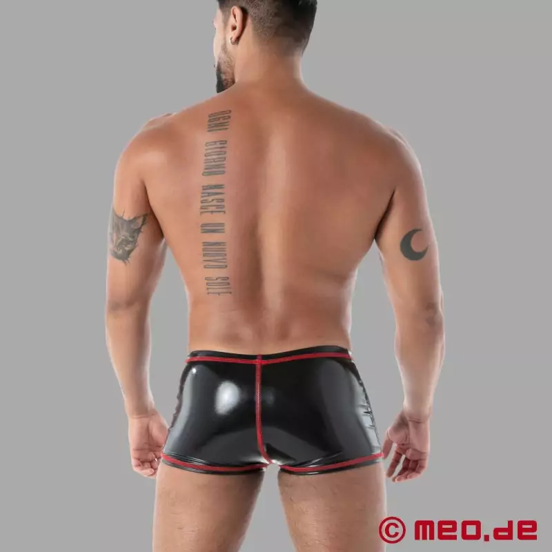 Sexy, maschile e senza compromessi: il Latex Trunk nero della collezione SecondSkin™ veste basso come un boxer, valorizza glutei e fianchi e crea un look high gloss che non passa inosservato. La superficie in latex è ultra brillante all'esterno, mentre il mix di tessuto elastico all'interno garantisce comfort e una vestibilità aderente. Le cuciture a contrasto rosse aggiungono un tocco grafico e rendono il Latex Trunk di MEO® la scelta perfetta per il club e per look sportivi e sexy. Progettato e realizzato a Parigi, in Francia.