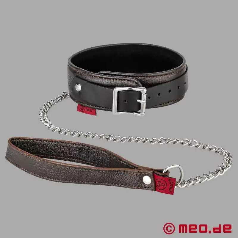 Het dragen van deze bondage must-have van bijzonder zacht, echt geitenleer is puur plezier! Dankzij het tijdloze, elegante ontwerp en de hoge kwaliteit geeft het je BDSM-sessie een geraffineerde uitstraling. De bondagehalsband biedt fantastisch comfort dankzij de zachte voering. Hij kan optimaal worden aangepast aan de nekomtrek met behulp van de gesp. De 90 cm lange riem is voorzien van een comfortabele handriem van hoogwaardig pelleer en is verbonden met een ketting. Met dit elegante bondage accessoire voelt je partner precies wie de baas is in jullie relatie en wie de lakens uitdeelt. De D-ring, die compatibel is met de meeste kettingen, touwen en boeien, maakt het gemakkelijk om de riem vast te maken met een karabijnhaak. De combinatie van fijn, donkerbruin geitenleer en bijzonder zacht fluweel creëert een esthetisch contrast tussen strengheid en tederheid.