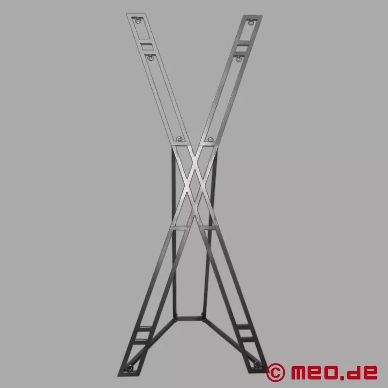 Naast BDSM meubels zoals kooien, schandpalen en nog veel meer, maken wij ook dit praktische Andreaskruis met standaard. Ons BDSM Andreaskruis is een tijdloos, demontabel metalen Andreaskruis voor vrijstaand gebruik zonder muurbevestiging. Het perfecte Andreaskruis voor elke behoefte en elke kamergrootte. Vergeleken met vergelijkbare producten laat dit Andreaskruis niets te wensen over, of het Andreaskruis nu privé wordt gebruikt of in een professionele BDSM studio. De stabiele basis maakt het mogelijk om dit Andreaskruis overal in de kamer te plaatsen, zodat het van alle kanten gebruikt kan worden. Natuurlijk kunnen er veel BDSM accessoires uit het MEO assortiment aan het kruis bevestigd worden. Omdat ons Andreaskruis gemaakt is van hygiënisch metaal, is het gemakkelijk schoon te maken na een bondagesessie (lichaamsvloeistoffen, kaarsvet, glijmiddelen, oliën, etc.). Het Andreaskruis wordt gedemonteerd geleverd, discreet en veilig verpakt. Montage is heel eenvoudig en ons bondage Andreaskruis is binnen 3 minuten klaar voor gebruik. Na gebruik kan het Andreaskruis snel worden gedemonteerd en discreet worden opgeborgen in de kledingkast of onder het bed.