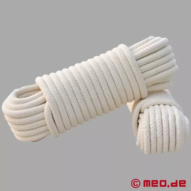Het bondage touw van MEO® is gemaakt van 100% hoogwaardig, ingewikkeld gevlochten katoen. Dit maakt het bijzonder zacht, voorkomt vernauwingen en blijft comfortabel op de huid, zelfs tijdens langere boei sessies. Tegelijkertijd maakt het indruk met zijn hoge treksterkte en uitzonderlijke robuustheid. Het is verkrijgbaar in verschillende kleuren en lengtes van 5, 10 en 20 meter.