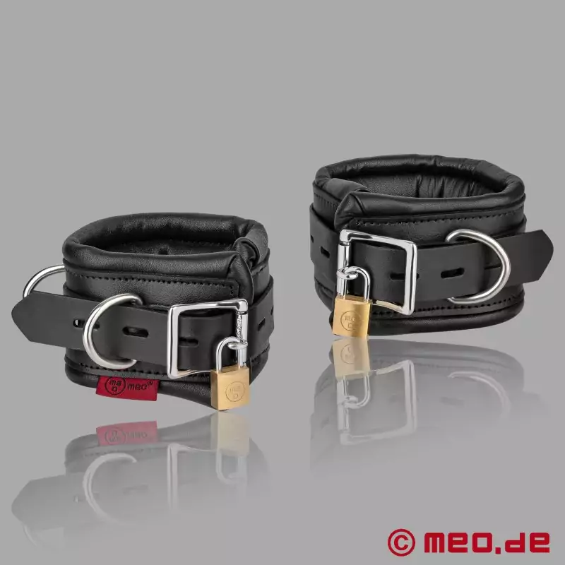 Naast deze leren enkelbanden bevat de Black Berlin™ serie van MEO® ook bijpassende polsboeien en een afsluitbare halsband. Hangsloten die op dezelfde manier vergrendelen zorgen voor een uniforme bediening van alle afsluitbare boei. De enkelboeien worden geleverd met twee hangsloten die op dezelfde manier vergrendelen. Dit is een voordeel omdat enkelboeien, enkelboeien en halsbanden met slechts één sleutel kunnen worden vergrendeld en geopend. Voor op tijd gebaseerde bondage set-ups, bijvoorbeeld in een Self Bondage context, kan een digitaal tijdslot zoals MEOBond® worden gebruikt als aanvullend accessoire - afhankelijk van het gewenste scenario en de individuele ervaring.