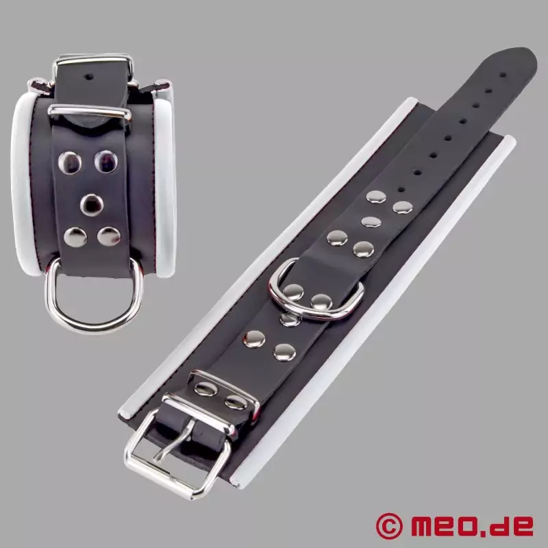 Onze zwart/witte enkelboeien zijn gevoerd met leer en hebben een zachte, afgeronde en opgerolde zoom die langs de rand van de stevige leren riem loopt. Dit garandeert veel comfort tijdens een BDSM-sessie en een lange levensduur van deze geweldige enkelboeien.