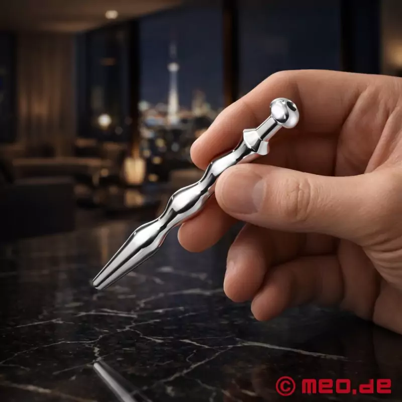 Technische gegevens: Dialator. Vervaardigd met behulp van het CNC-proces. Medisch roestvrij staal. Doorgaand gat. Ca. 75 mm lang. Golfvormig met 3 golven, oplopend van 5 mm tot 8 mm. Hemisfeer aan het uiteinde dat uit de eikel steekt.
