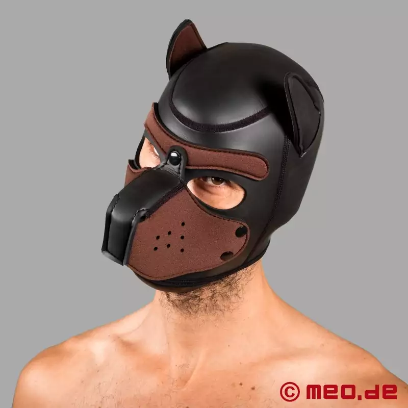 Stuur een duidelijke boodschap naar je roedel met het zwart met bruine hondenmasker van Bad Puppy. Dit masker schreeuwt actie op vier poten en met een opgeheven staart. Het zachte, elastische neopreen hondenmasker van Bad Bad Puppy past perfect om het hoofd zonder vervelende ritsen of veters aan de achterkant. Het is ideaal voor iedereen die zijn rol in Human Pup Play serieus neemt.
