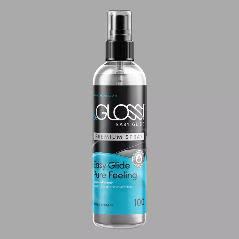 beGLOSS® Easy Glide™ is zeer zuinig en kan de glans van transparante latex zichtbaar verbeteren. Het heeft ook een antistatisch effect, is geschikt voor gechloreerde latex en helpt latex kleding te beschermen tegen vroegtijdige slijtage en kleven.