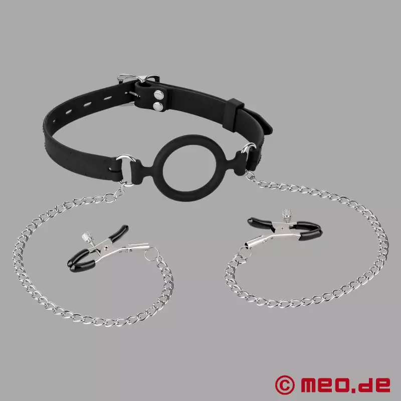 De O-ring mondknevel is verbonden met twee metalen kettingen, waaraan twee tepelklemmen zijn bevestigd. Laat je partner je mondknevelen met de O-ring gag en bevestig de twee tepelklemmen aan je tepels. De kleine sluitschroeven helpen je om de optimale druk en perfecte pasvorm van de tepelklemmen te bepalen.