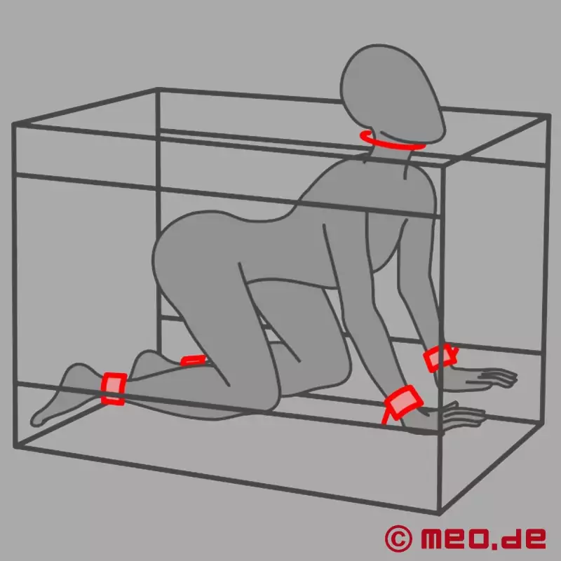 En myk gulvmatte og LED-belysning gir ekstra komfort, mens de medfølgende håndjernene og ankelhåndjernene (ett par hver) sørger for sikker fiksering takket være den myke polstringen og spennefestet. Håndjernene og ankelmansjettene kan plasseres fleksibelt innvendig, slik at du selv kan bestemme hvordan subben skal presenteres.