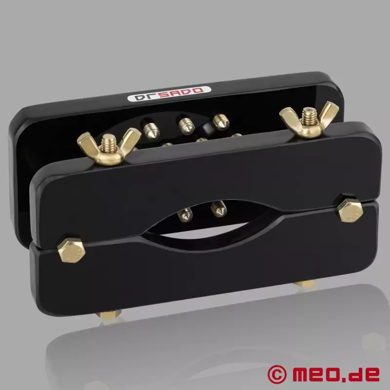 Zwischen zwei Platten gelagerte Hoden können in unterschiedlicher Intensität gepresst bzw. gequetscht werden. Die goldfarbenen Dornen können einzeln und mit zunehmender oder wechselnder Intensität zum Einsatz gebracht werden. Damit ist es möglich, die CBT Hoden Behandlung von wollüstig zart bis ultrahart intensiv zu variieren. So kann jedem devoten Herrn seine Belastungsgrenze deutlich aufgezeigt werden. Mit jeder Veränderung der Einstellungen ist es möglich, die Belastungsgrenzen weiter zu verschieben und die Erziehung zu intensivieren.