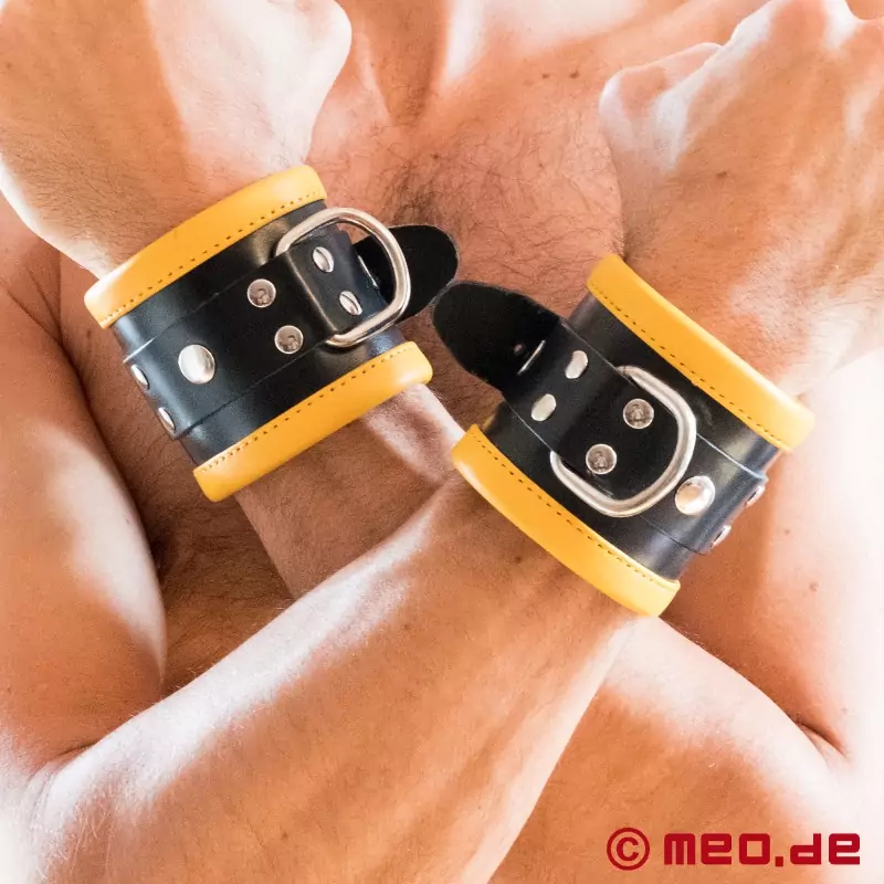 Distinct™ håndjern i lær, polstret, svart/gul, fra MEO®