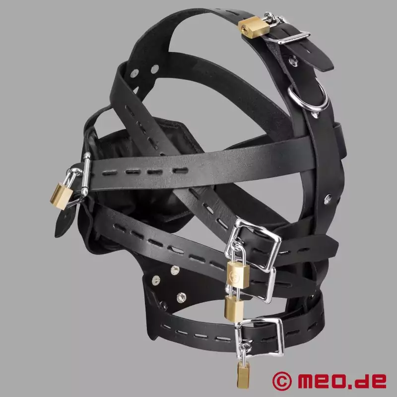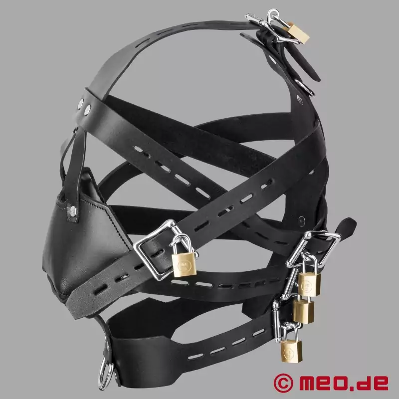 For maksimal kontroll, umiskjennelig begrensning og et kompromissløst utseende. MEO® SlaveHarness™ er en låsbar hodesele med munnkurv som gjør underkastelsen synlig og håndgripelig, og som omslutter hodet på en sikker måte. Fem låsbare stropper fester hodeselen sikkert til hodet og kan justeres for å passe til mange hodestørrelser. Munnkurven sitter tett rundt kjeven, lukker munnen og reduserer den verbale kommunikasjonen betydelig - ideelt for rollespill der kroppsspråk, pust og tilstedeværelse er toneangivende.