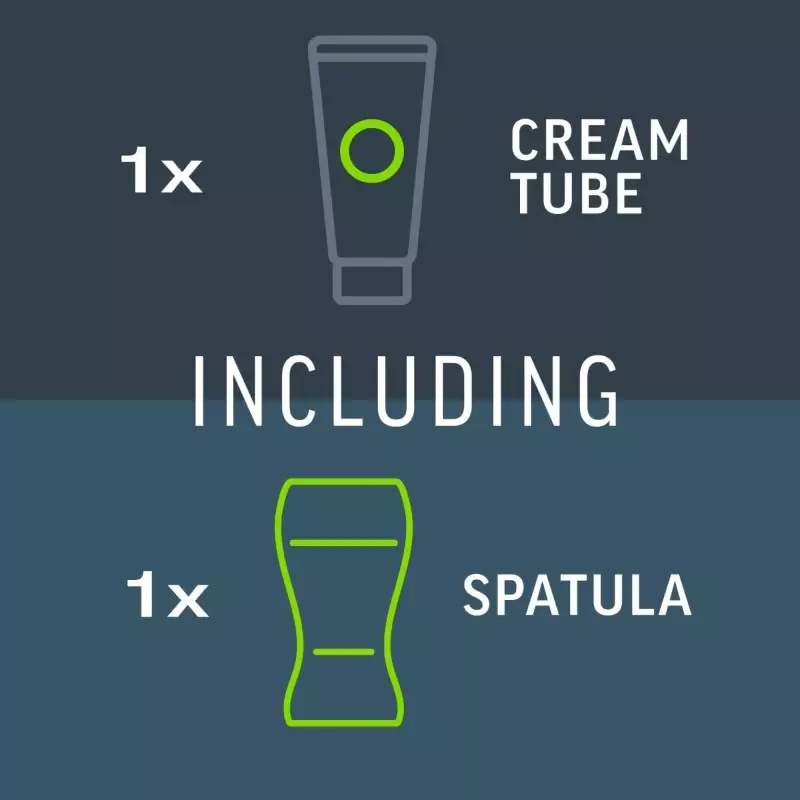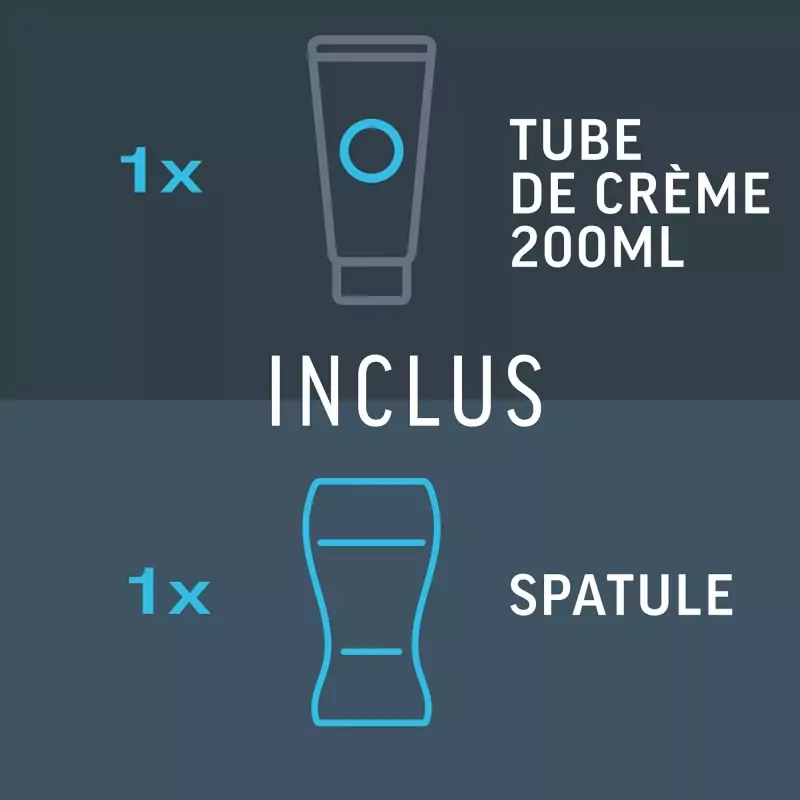 Les og følg alle viktige instruksjoner før bruk. Påfør kremen jevnt slik at hårene dekkes helt. Effekten starter etter 3 minutter. Etter 3 minutter kan du teste et lite område for å se om håret allerede kan fjernes. La eventuelt kremen virke i noen minutter til, men ikke lenger enn 6 minutter totalt. Fjern deretter kremen og skyll huden grundig med vann.