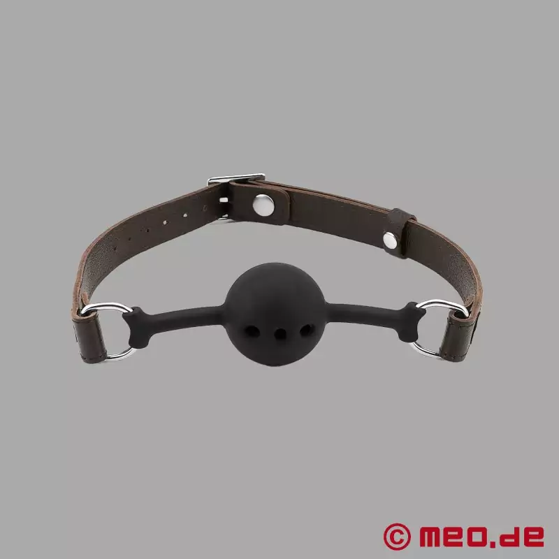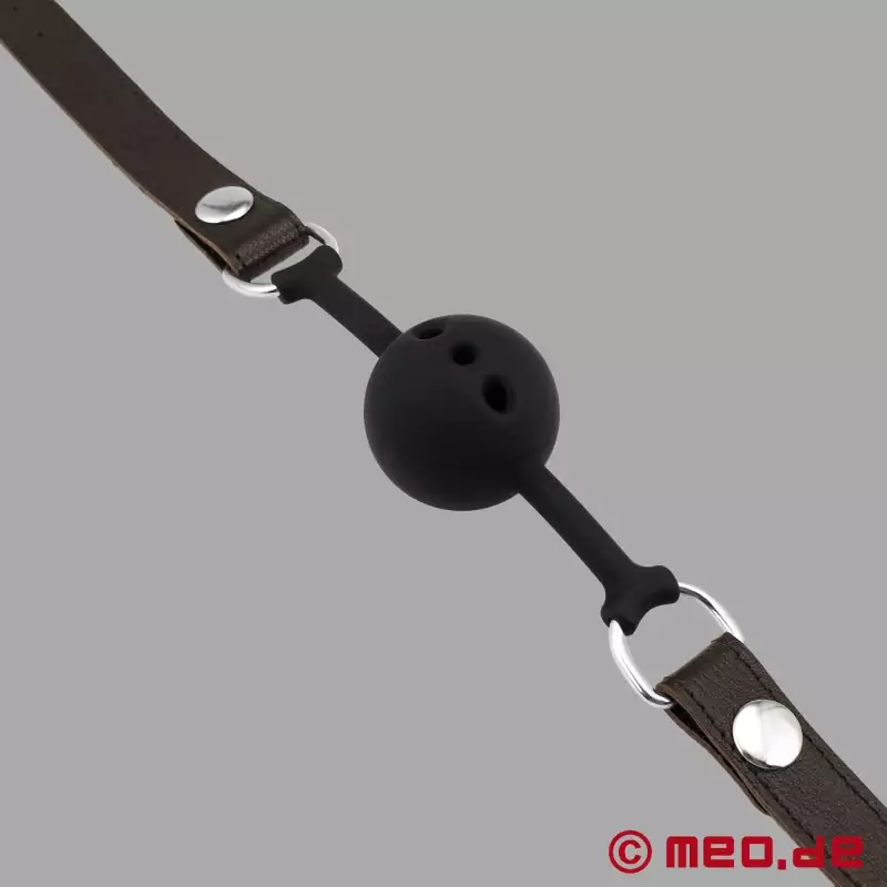 For å beskytte munnvikene under bruk, er knebleballen utstyrt med en silikonforbindelsesstang. Silikonet som brukes er kroppssikkert og smakløst. Knebleballen plasseres i munnen, og hodestroppen plasseres rundt hodet. Spennefestet gjør at passformen kan justeres individuelt til alle hodestørrelser. Nyt stillheten og det fantastiske synet! Den bittsikre knebleballen lar heller ikke noe å ønske! Med en diameter på 43 mm er den verken for stor eller for liten. Takket være pustehullene sørger den for tilstrekkelig lufttilførsel under knebling.