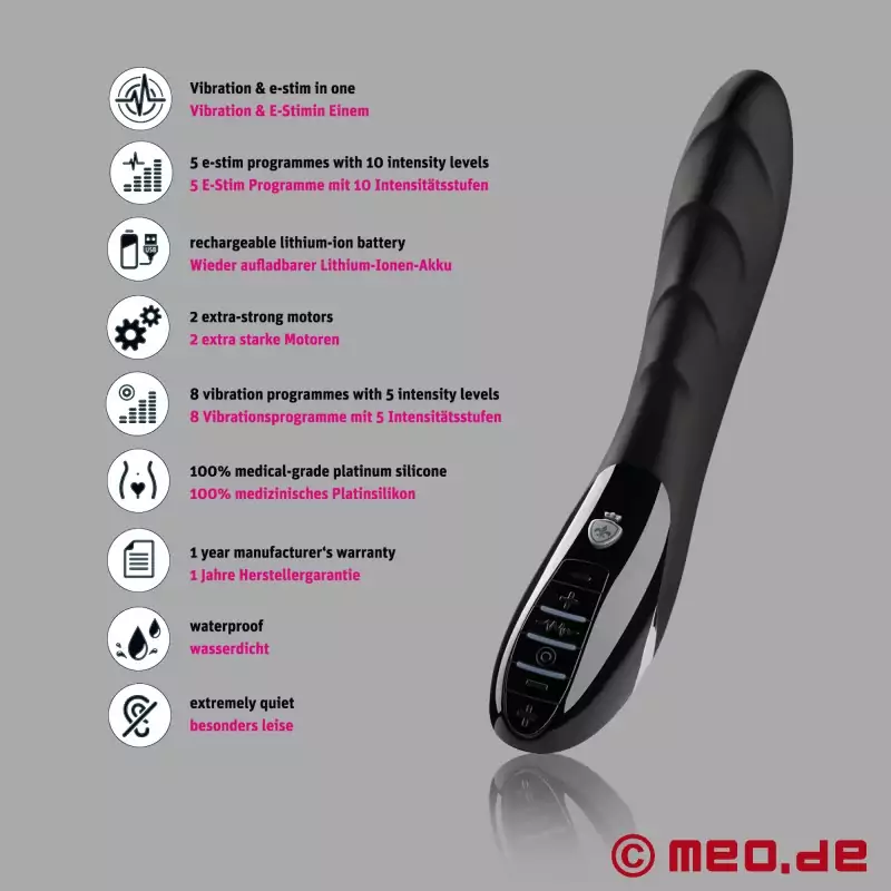 Enten du vil ha en mild prikkende følelse eller dypt gjennomtrengende impulser - du bestemmer selv om du vil oppleve vibrasjon og e-stim hver for seg eller i kombinasjon. Kroppen din vil svare - med orgasmer i en klasse for seg. Det er et løfte!