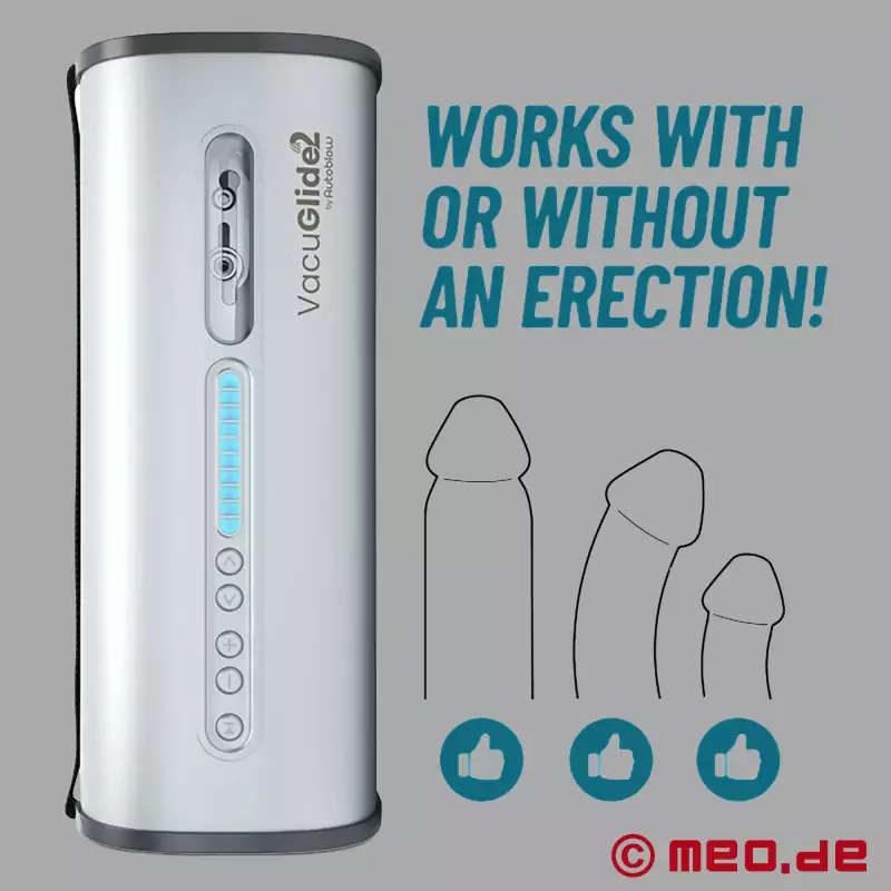 Nytt med VacuGlide™ 2: mer kontroll, flere programmer, flere muligheter. Den nyeste versjonen av AutoBlow® onanimaskinen tilbyr 20 hastigheter (i stedet for de tidligere ti), inkludert svært langsomme hastigheter med opptil ti strøk per minutt. I tillegg er ti offline-programmer, de såkalte "Stroking Experiences", tilgjengelige der bevegelsen til sylindrene varieres automatisk. VacuGlide™ 2 er WLAN-kompatibel, noe som gjør online-funksjoner som fjernkontroll, autopilot, nedlastbare moduser og videosynkroniseringsfunksjoner tilgjengelige.