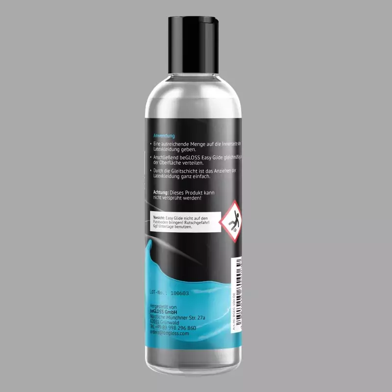 beGLOSS® Easy Glide™ er et flytende påkledningshjelpemiddel for lateksbekledning som kjennetegnes av sine utmerkede glideegenskaper. Det gjør det lettere å ta av og på lateksbekledning og gir en behagelig følelse. beGLOSS® Easy Glide™ er spesielt godt egnet for hudtette latekscatsuits, leggings, klær og masker av tynn, delikat lateks. Produktet har utmerkede glideegenskaper, selv med kraftig kroppshår. Produsert i Tyskland.