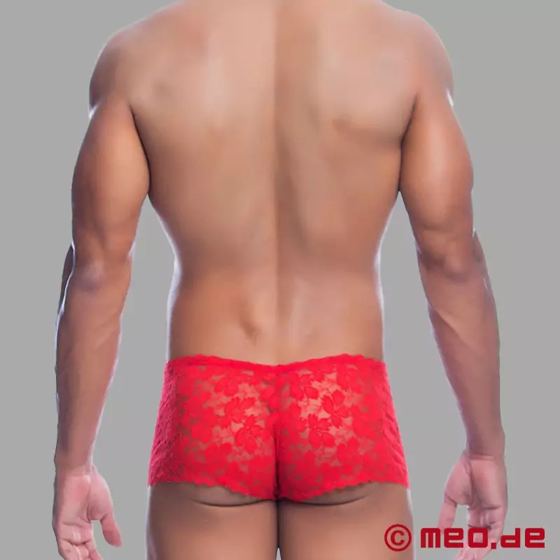 Lidenskapelig. Forførende. Sexy. De røde Rose Lace Mini Shorts™ er en ren provokasjon og en kjærlighetserklæring til kroppen din. Fine, røde blonder smyger seg om huden din, gir et intimt innblikk og lar dine vakreste sider skinne. Dette undertøyet for menn er alt annet enn sjenert. Det er laget for menn som ønsker å kjenne seg selv - og bli sett.