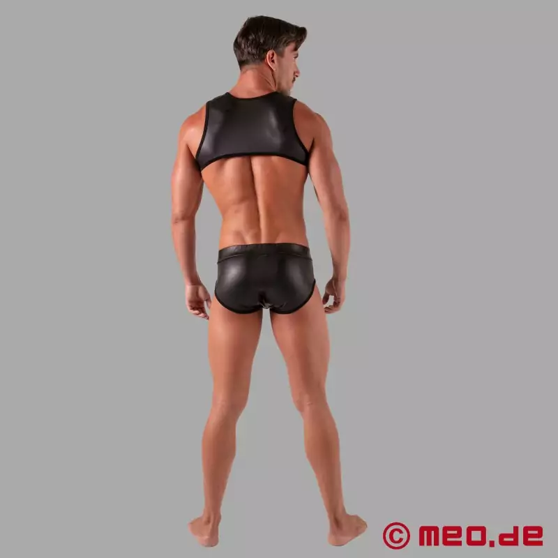 Det myke, pustende og elastiske materialet sitter som et annet skinn, beholder sin subtile glans og er ideelt for klubbkvelder, private BDSM-økter eller når som helst når du ønsker å vise maksimal, sexy tilstedeværelse. Snøringen foran gjør at du kan justere passform og eksponeringsgrad med millimeterpresisjon.