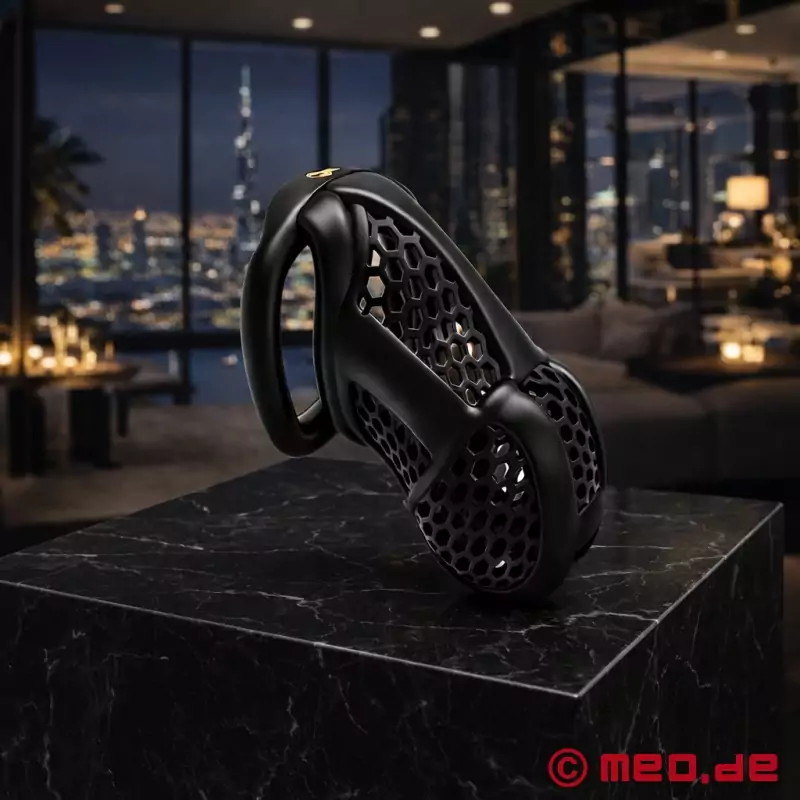 BlackGuard™ er spesielt sterk når det gjelder langvarig kyskhet. Den sitter sikkert, kan tilpasses individuelt og holder penis innelåst på en pålitelig måte. Samtidig sørger den sofistikerte bikakestrukturen med ventilasjonsåpninger for luftsirkulasjon og dermed en tørr og behagelig passform, selv ved langvarig bruk.